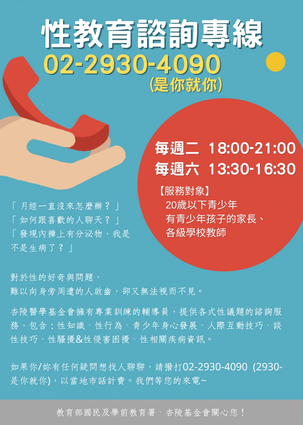 主旨:檢送教育部國民及學前教育署委託財團法人杏陵醫學基金會辦理「109 學年度校園性教育(含愛滋病防治)計畫」之「性教育電話諮詢專線」,鼓勵各級學校推廣應用,詳如說明,請查照。
