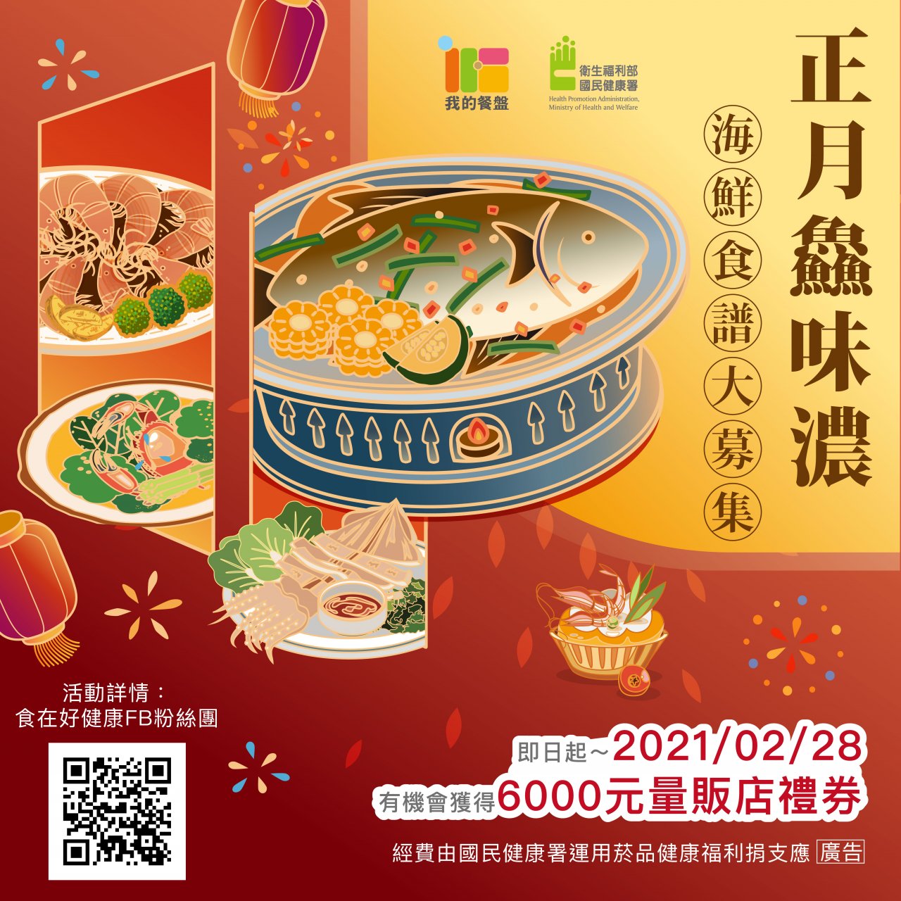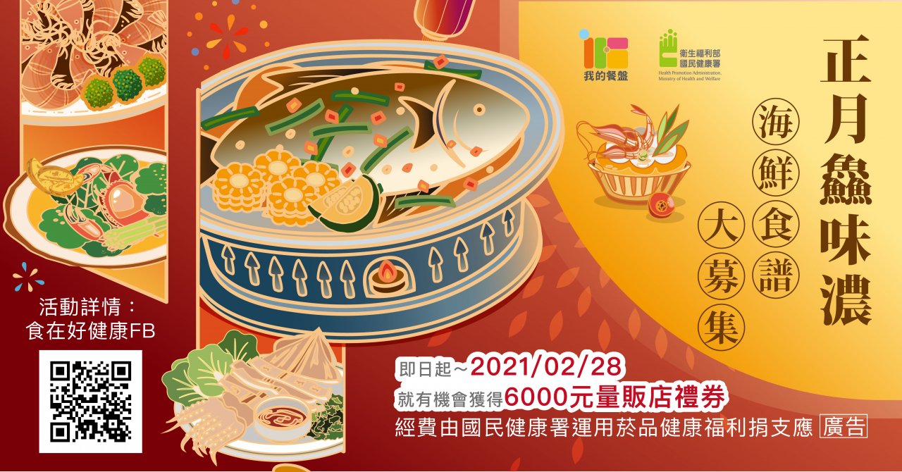 請民眾設計海鮮料理食譜,且需要 搭配蔬菜類及全榖雜糧類。符合徵件範圍者可獲得抽獎資 格,得獎者將致贈量販店禮券。詳細活動辦法請見健康署食在好健康粉絲專頁( https://www.facebook.com /eatinghealth.tw )。