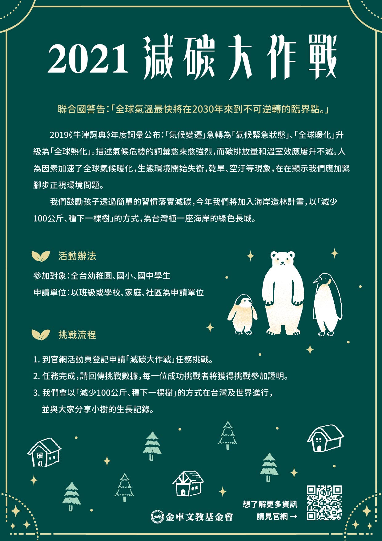 一、臺灣是一個海島國家,在氣候變遷、全球暖化影響下,受 到的威脅和衝擊更為嚴重。本會舉辦「2021 年減碳大作 戰」,鼓勵學生從日常行動中,將減碳習慣落實生活,透 過簡單的任務挑戰,讓保護環境理念深植心中。 二、活動對象:全台國小、國中、高中學生。 三、挑戰時間: 2021 年 4 月至 11 月 30 日,連續七天挑戰,可重覆 申請。 四、活動內容: (一)至金車文教基金會官網(https://kingcar.org.tw/我要 報名/減碳大作戰)登記申請挑戰卡,進行七日挑戰。 (二)每一位挑戰者將獲得挑戰參加證明,基金會也會在最適 合種樹的季節,以「減少 100 公斤、種下一棵樹」的方式 在台灣及世界進行。五、活動聯絡人:張景羽,電話: 02-23662828 分機 6508 傳真: 02-23659053 ,信箱: admin@kingcar.org.tw