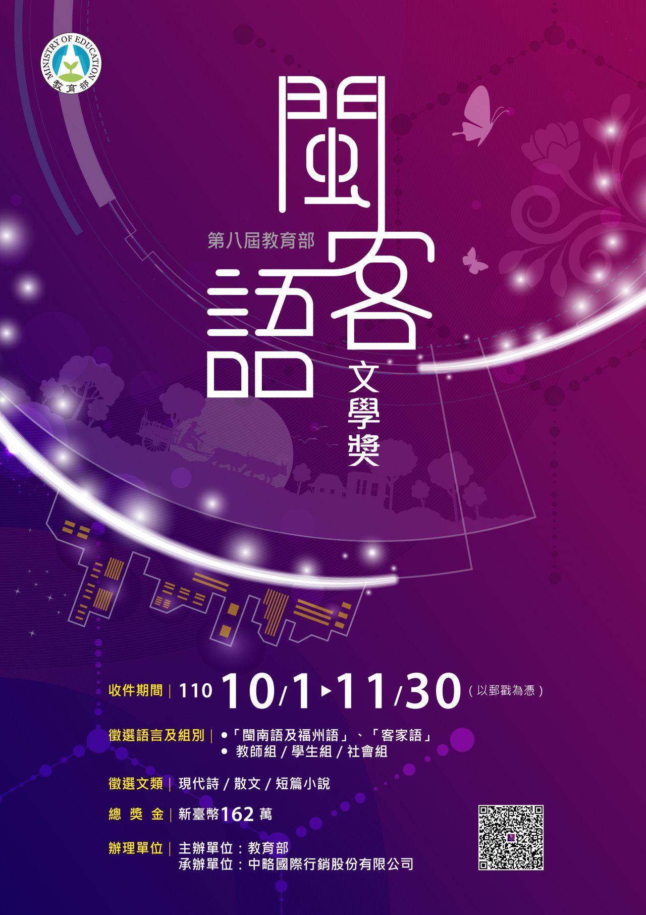 | 三、 | 旨揭活動徵件日期自 110 年 10 月 1 日起至 110 年 11 月 30 日止,詳情及簡章資料下載請至教育部終身教育司網站( https://depart.moe.edu.tw/ED2400/Default.aspx )電子布告欄,或電洽:( 02 ) 2726-2230 分機 125 曹小姐。 |