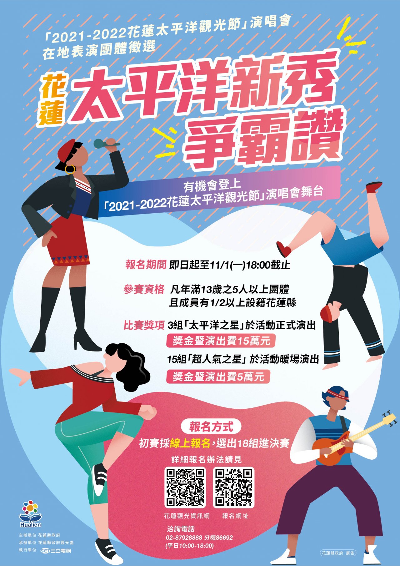 一、活動目的:藉由公開徵選競賽方式,選出「2021-2022 花蓮 太平洋觀光節」演唱會在地表演團體,提供優秀表演者嶄 露頭角的舞台,藉以培植花蓮在地表演人才,並發掘具潛 力之表演新秀。 二、參加對象:每組表演人數須達 5 人以上,全員須年滿 13 歲以 上,團體之表演人員須有 1/2 以上設籍花蓮縣,且每人限報 1 組(不得跨組或重複報名)。 三、比賽獎項: (一)太平洋之星: 3 組,可成為「2021-2022 花蓮太平洋觀光 節」演唱會活動正式演出團體,每組獲得獎金暨演出費 用新臺幣 15 萬元。 (二)超人氣之星: 15 組,可成為「2021-2022 花蓮太平洋觀光 節」演唱會活動暖場演出團體,每組獲得獎金暨演出費用新臺幣 5 萬元。 四、報名期間:即日起至 11 月 1 日(一)18 時止,初賽統一採線上 報名(報名網址: https://reurl.cc/vg6Zna),將選出 18 組 團隊,進入決賽。 五、相關徵選辦法請詳閱花蓮觀光資訊網(https://tourhualien.hl.gov.tw/news/latest/962),如有任何疑問可 於平日上班時間諮詢:(02)87928888 分機 86692 ,三立電視 創意行銷部呂先生