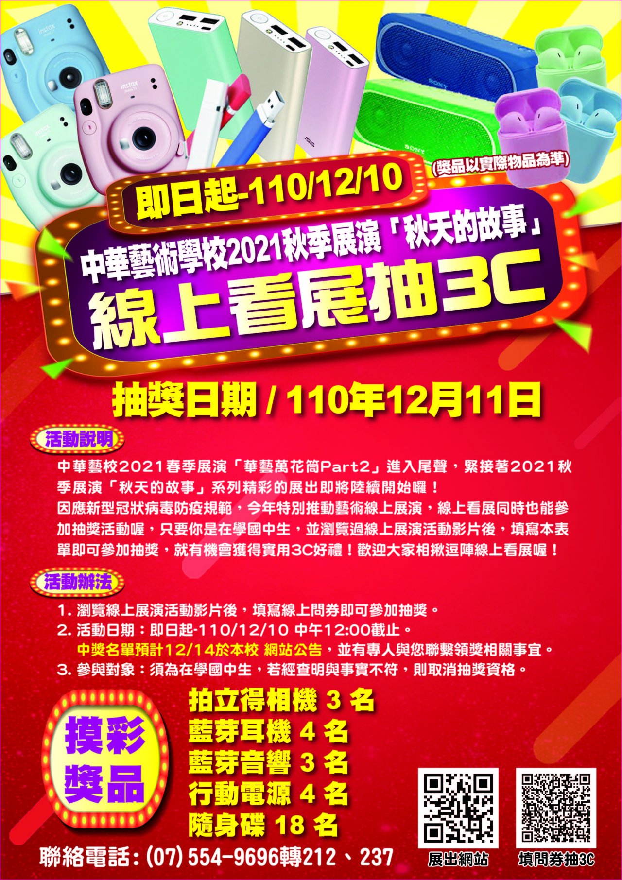 一、因應新型冠狀病毒防疫規範,中華藝校今年特別推動藝術 線上展演,瀏覽線上展演活動影片後填寫線上問卷即可參 加抽獎活動。 二、參與資格:全國公私立學校在學國中生均可報名參加。 三、展出網站: (一)網頁搜尋:中華藝術學校/點選 秋季展演 頁面 (二)網址: https://reurl.cc/dxAWvV