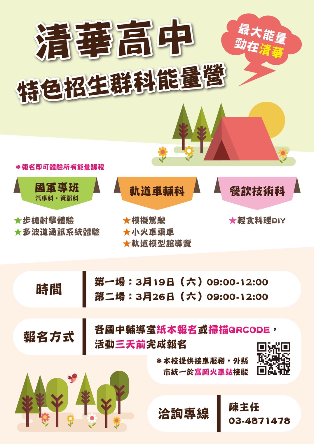 • 特色招生群科能量體驗營時間:(一)第一場:03/19(六)09 : 00~12 : 00 。(二)第二場:03/26(六)09 : 00~12 : 00 。