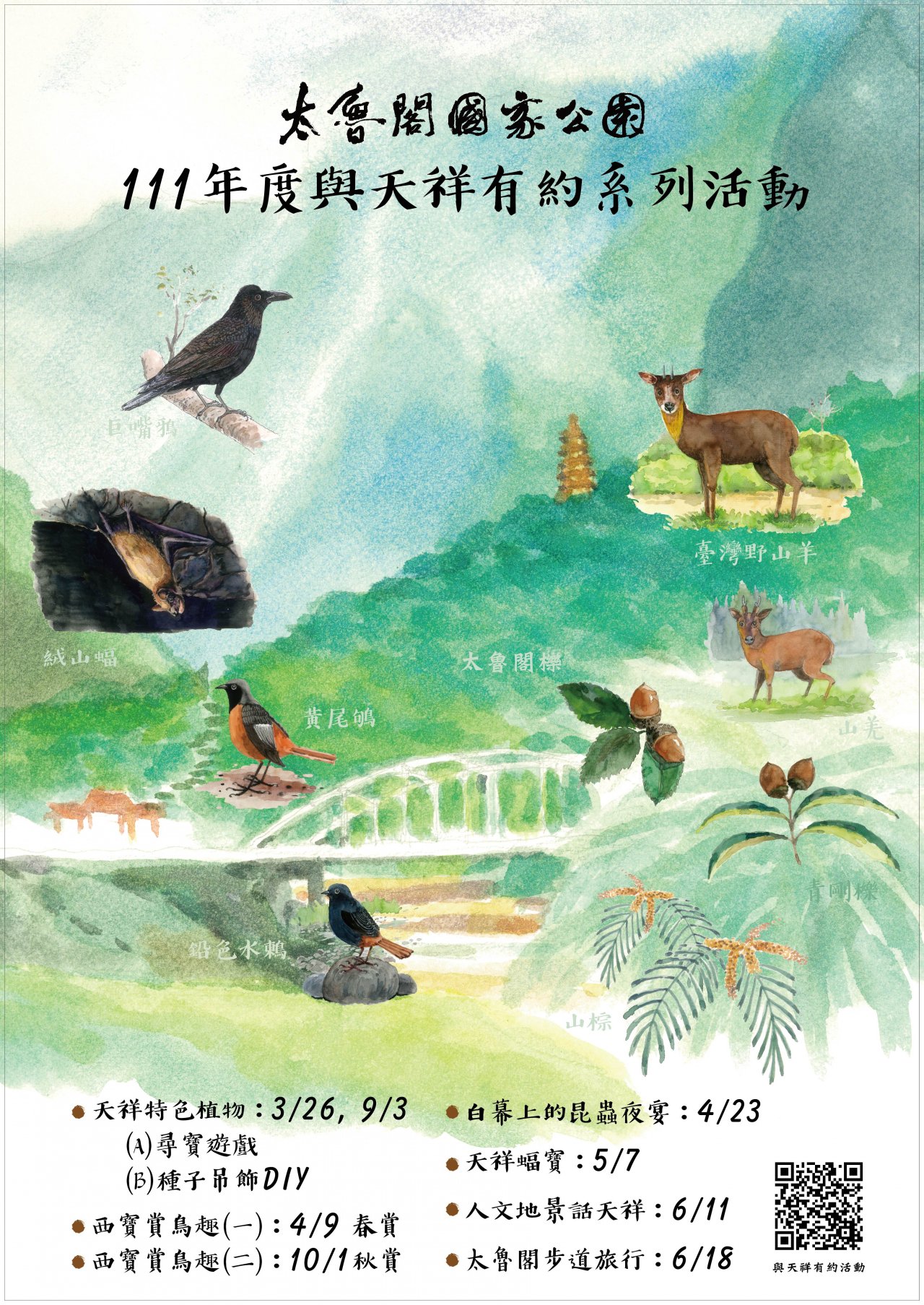 一、依據太魯閣國家公園管理處(下稱該處)111 年 3 月 10 日太天 字第 1111002952 號函辦理。 二、 111 年 3 月至 10 月該處將辦理 6 項 8 場的系列活動,包含 6 場自 然體驗及 2 場文史演講,活動地點為天祥管理站與周邊、西 寶及文山公園等,活動項目如下,詳情請參活動說明書: (一)天祥特色植物: 3/26 、 9/3 ,(A)尋寶遊戲、(B)種子吊 飾 DIY (二)西寶賞鳥趣:(一)春賞 4/9 、(二)秋賞 10/1 (三)白幕上的昆蟲夜宴: 4/23 夜間活動 (四)天祥蝠寶: 5 /7 夜間活動 (五)人文地景話天祥: 6/11 (六)太魯閣步道 旅行: 6/18 三、每場活動以 20~30 人為限,報名方式分成「事前網路報名」及「現場報名」,因交通及安全考量,賞鳥活動(4/9 、 10 /1)及夜間活動(4/23 、 5/7)僅限「事前網路報名」。活動 資訊請參活動官網