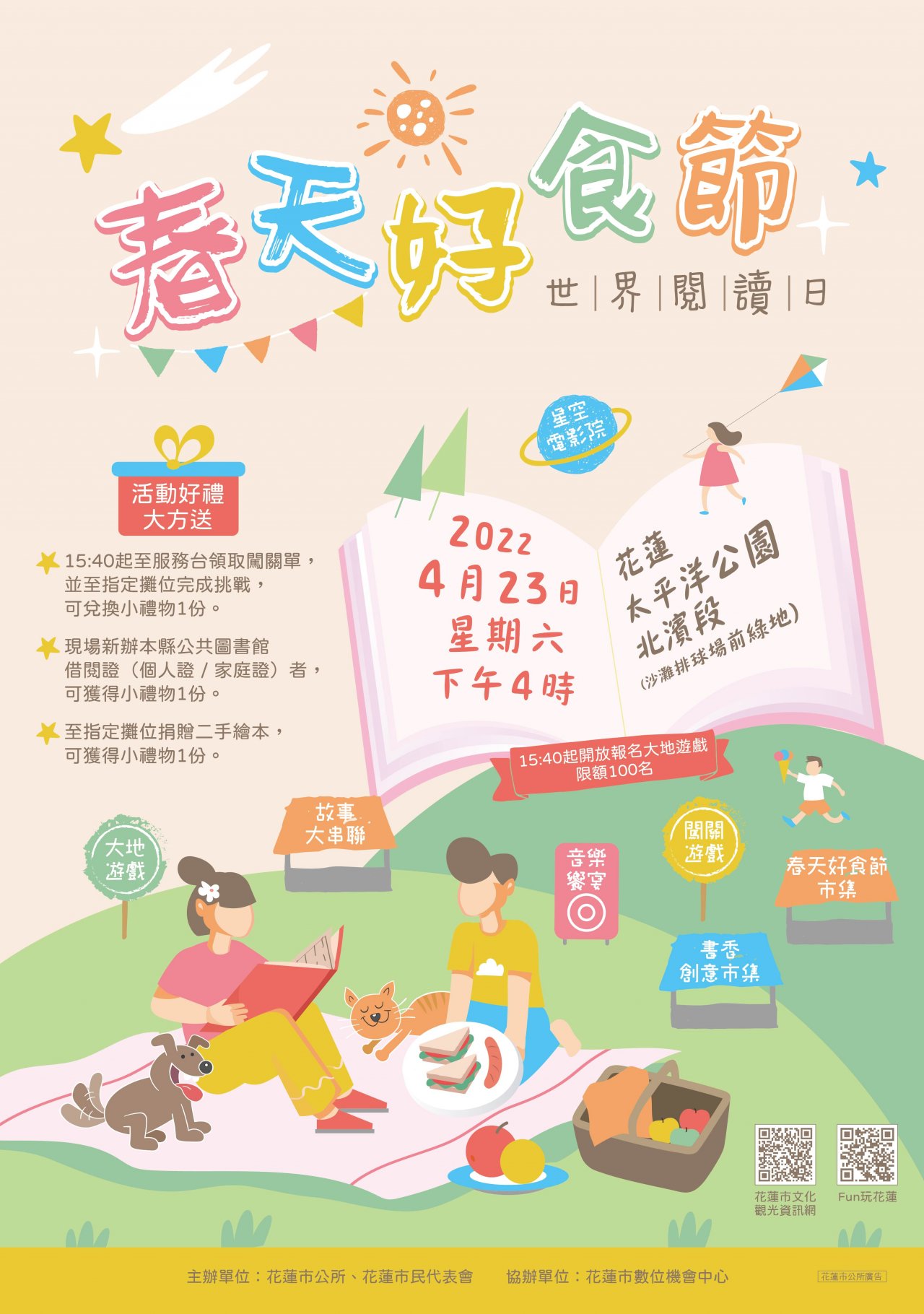 一、旨揭活動將「食」的野餐與「書」的閱讀結合,鼓勵大小 朋 友攜手至戶外體驗不同趣味,並藉由一塊野餐布拉近彼 此相 互關懷與互助合作的情誼。 二、活動資訊: (一)活動時間: 111 年 4 月 23 日(週六)16 時至 21 時。 (二)活動地點:花蓮太平洋公園北濱段(曙光廣場)。 (三)更多活動資訊請至花蓮市文化觀光資訊網 ( https://culture-tourism.hualien.gov.tw /activity_dt.php?id=52 )