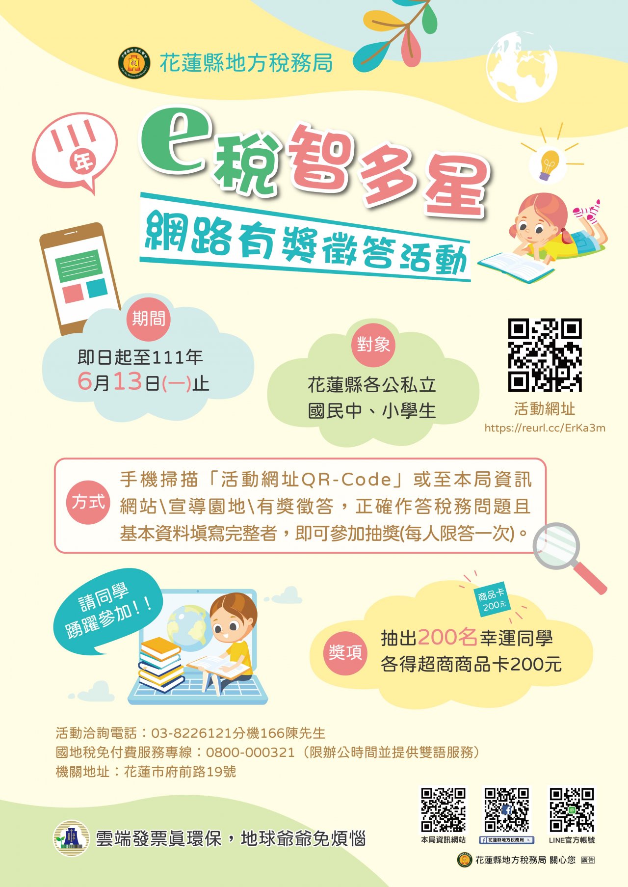 一、依據本局 111 年國中小學生「e 稅智多星」網路有獎徵答活 動計畫辦理。 二、活動網址:花蓮縣地方稅務局網站 https://www.hltb.gov. tw/宣導園地/有獎徵答,或點選網址 https://reurl.cc /ErKa3m 進入活動頁面。 三、活動方式及獎項:每人限作答 1 次,全部答對並留下基本資 料者,即可參加抽獎,於活動結束後擇日公開以電腦隨機 抽出 200 名幸運同學,各得超商商品卡 200 元 1 份。 四、檢送活動海報 1 份(如附件)。