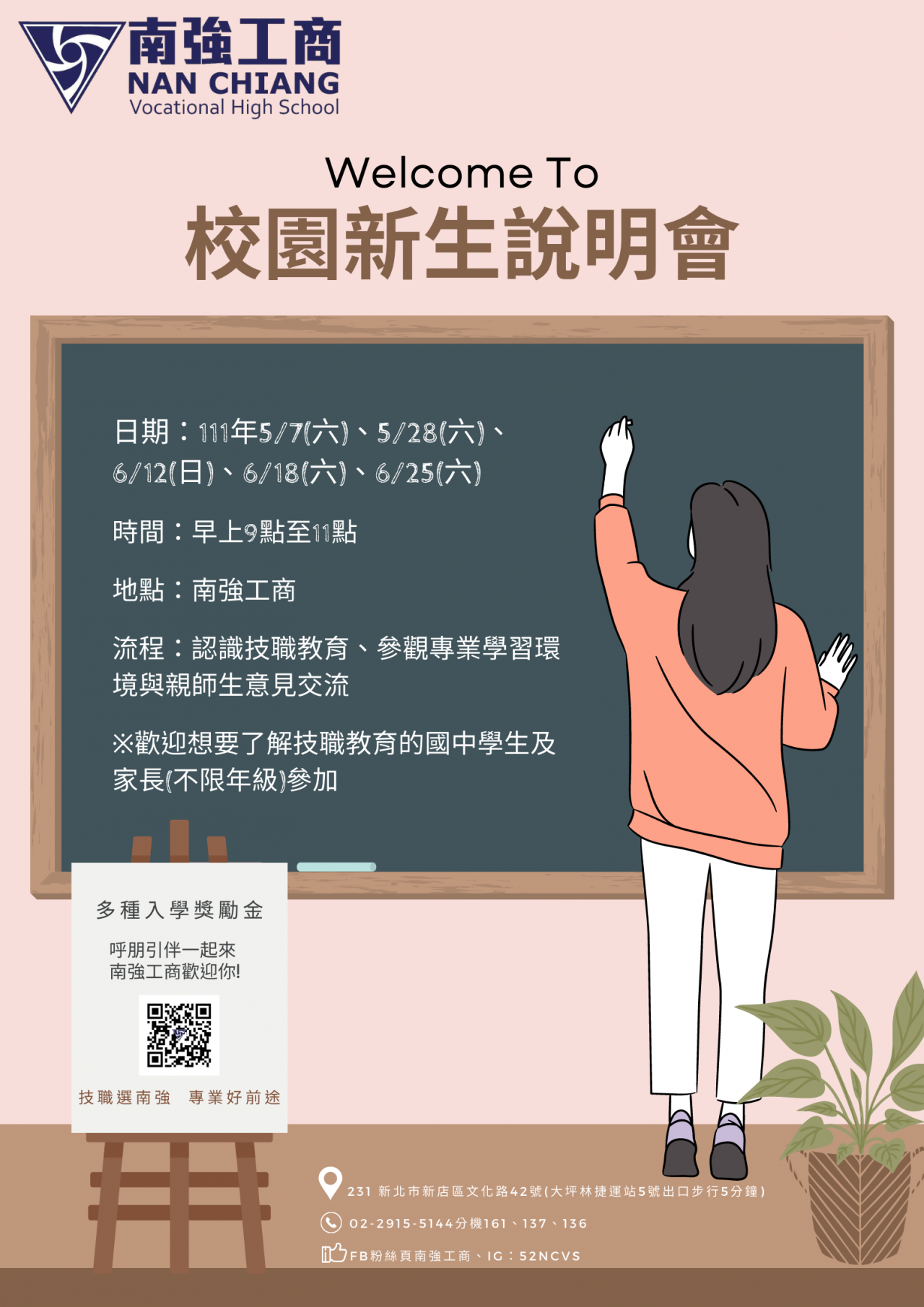 | 三、 | 課程主題:認識技職教育、專業設施線上導覽與親師生意見交流,想要了解技職教育的國中學生及家長(不限年級),可直接掃描附件海報上的 Qrcode ,線上報名參加。 |