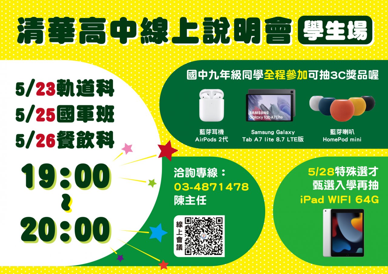 | 一、 | 對象:國中九年級同學全程參與可抽 Air Pods2 、三星平板及藍芽耳機(每場皆各抽一台)。 |
