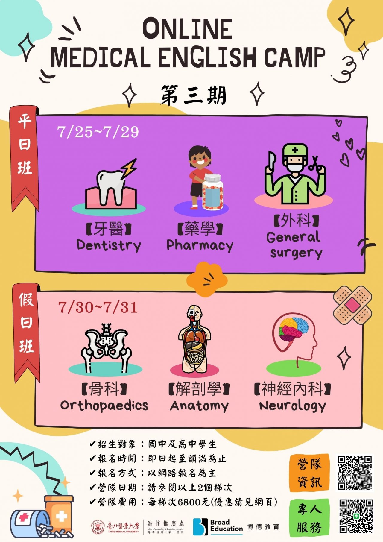 一、本校結合北醫專業醫療師資、國際師資及國際學生的資 源,創造英語的環境,讓學童們能藉由營隊期間的各種課 程與活動啟發對於醫學領域的興趣,延展對職涯探索的新 領域。 營隊將於 111 年 7 月 25 日至 111 年 7 月 31 日期間辦理「線上英文 醫學營第 3 期」,總共預定辦理 2 個梯次的營隊,分別為第 1 梯 平日班 7/25~7/29 、第 2 梯假日班 7/30~7/31 ,惠請貴單位協助 轉發,並歡迎共襄盛舉。 二、本處亦可針對各校需求辦理營隊說明會,凡參與人數達 10 人,即可進行線上說明會,洽詢電話為 02-6638- 2736#1307(yurihuang@tmu.edu.tw)黃小姐。