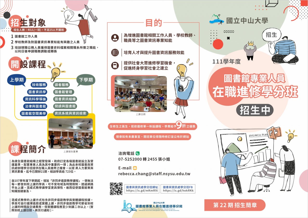 三、 檢附招生簡章、報名表、繳費流程說明,意者請於 112 年 2 月 1 日前,將報名表、相關證明文件及繳費收據影本寄交國立中山大學圖書與資訊處知識創新組張小姐收。