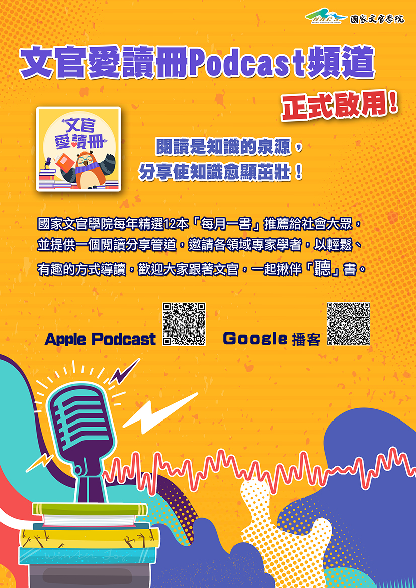 | 二、 | 「文官愛讀冊」Podcast 頻道已上線閱讀人鄭俊德介紹每月一書《長思短想》、《愛的藝術》、《寫給公民的 40 堂思辨課》、《地圖會說話》、《人生就是賽局》以及呂育誠教授導讀《長思短想》上、下集等 7 段節目,歡迎收聽並訂閱追蹤。 |