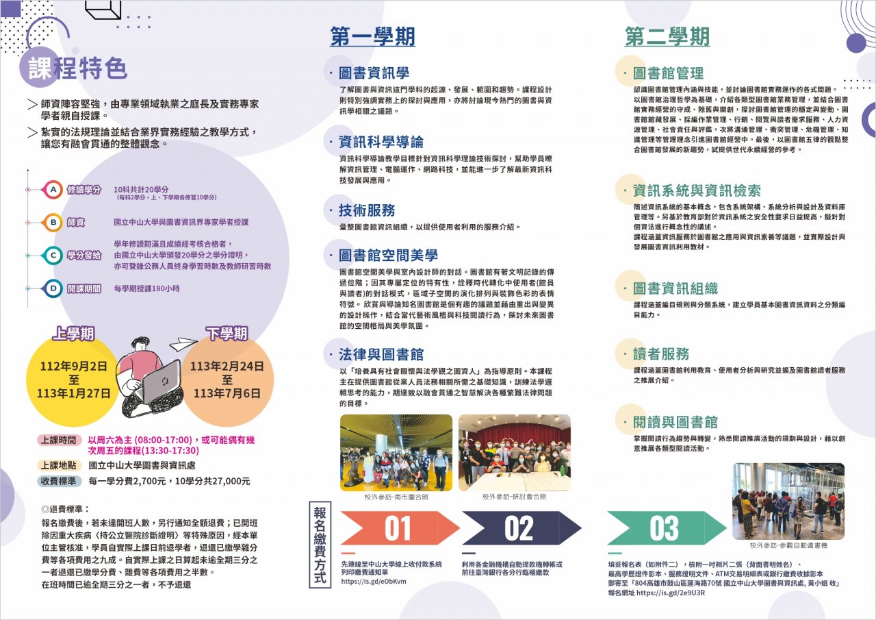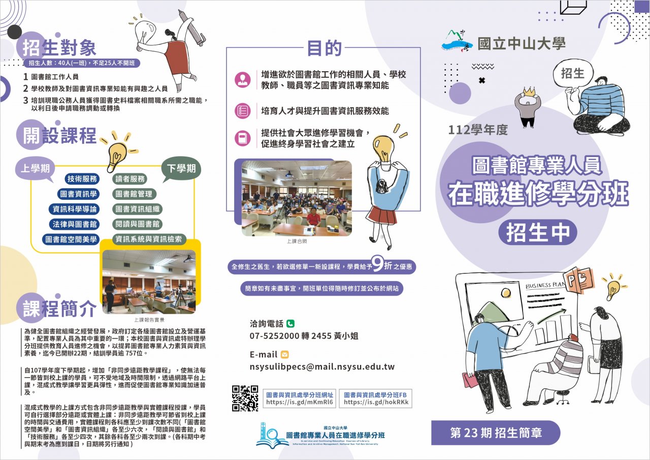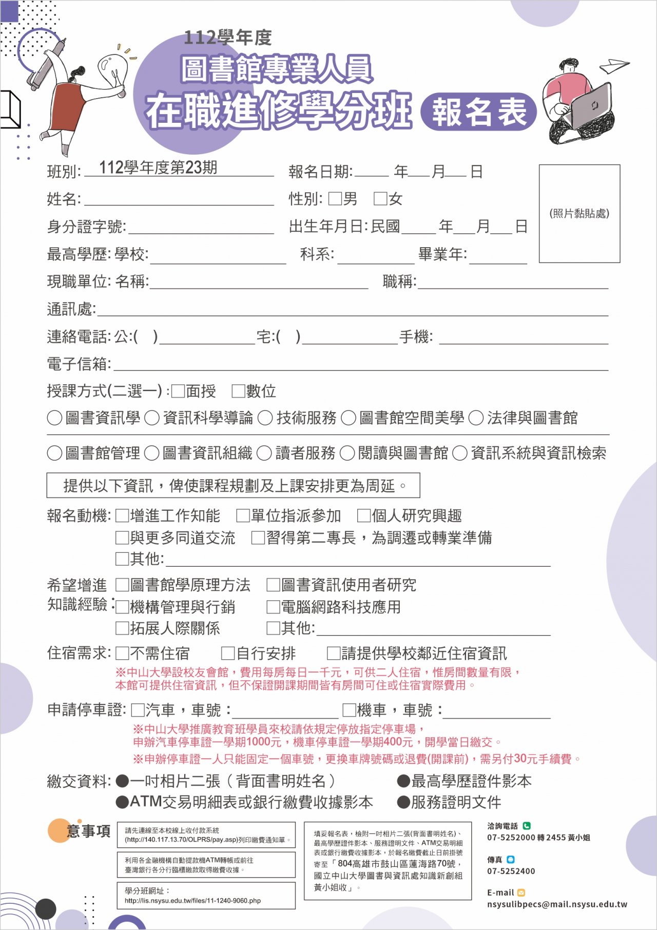 | 六、 | 檢附招生簡章、報名表、繳費流程說明,意者請於 112 年 8 月 28 日前,將報名表、相關證明文件及繳費收據影本寄交國立中山大學圖書與資訊處知識創新組黃小姐收。 |