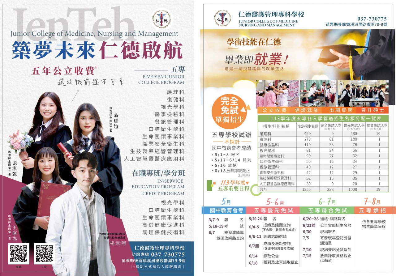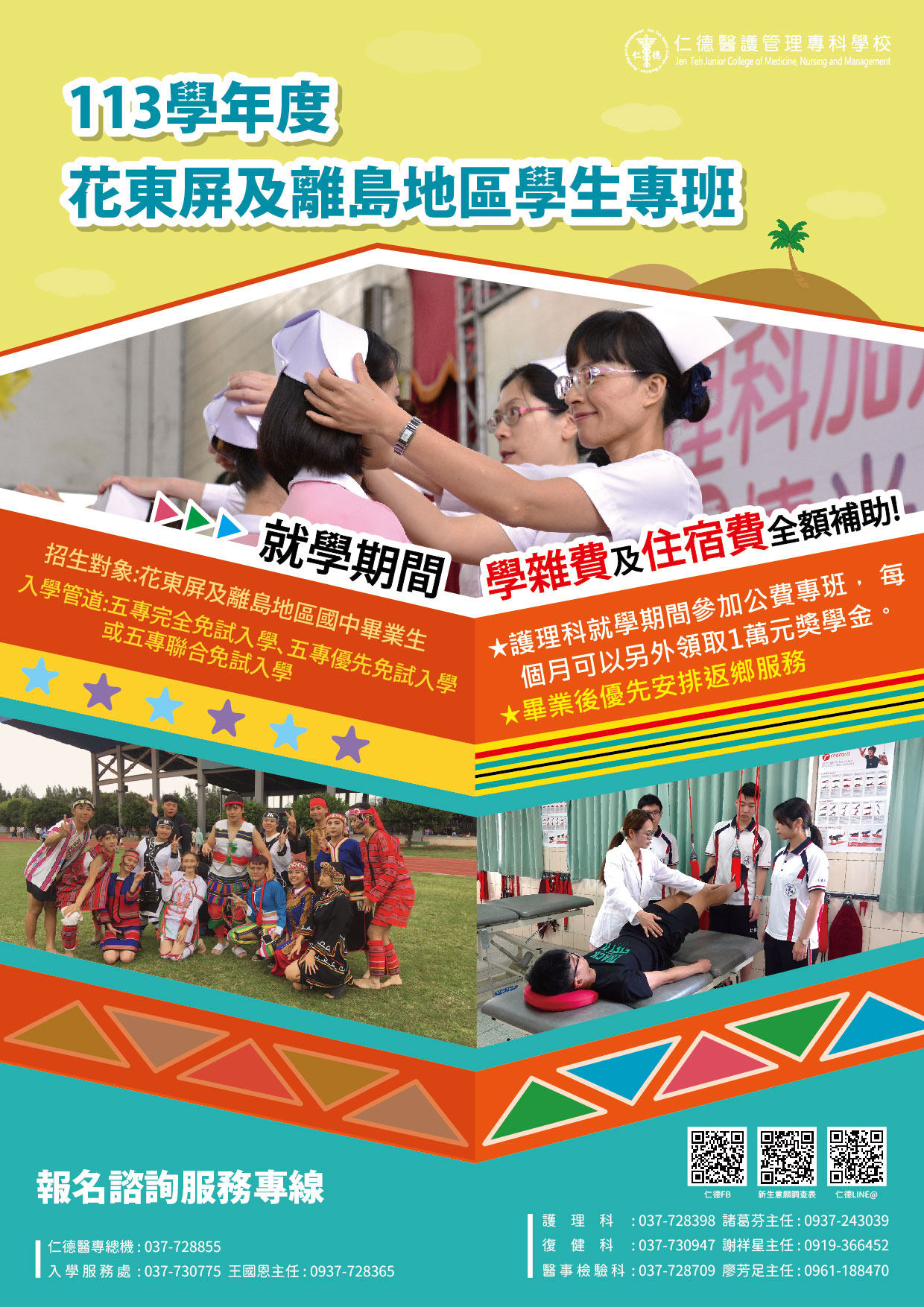 四、有意願學生可填寫「113 學年度仁德醫專花東屏及離島地區學生專班申請表」,表單網址:https://forms.gle/EGyStEJq4Jcr5pkm8