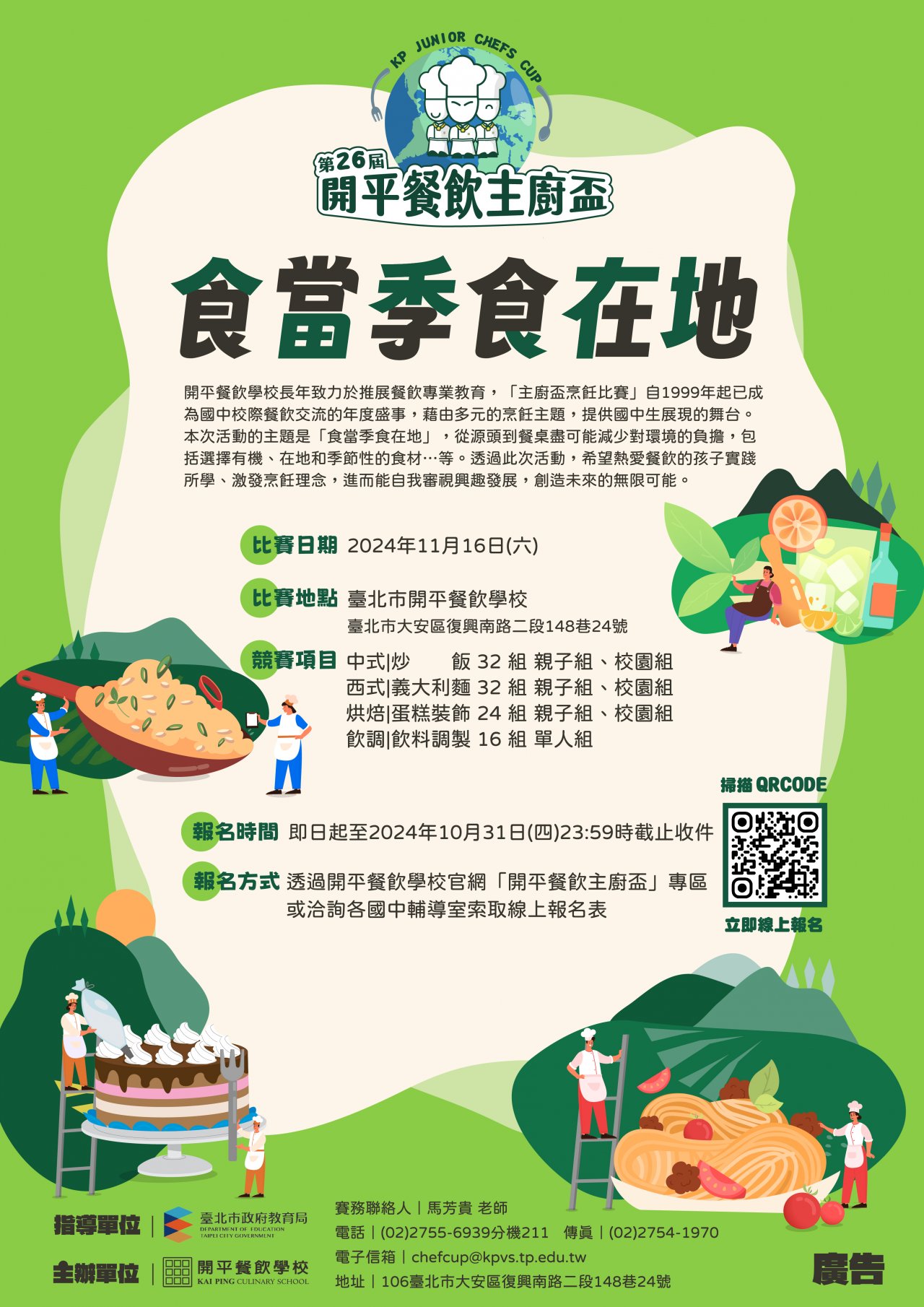 | 四、 | 相關比賽辦法,報名資訊隨函檢附,詳細比賽資訊請參閱第 26 屆開平餐飲主廚盃網頁(https://sites.google.com/kpvs.tp.edu.tw/kpvsjcc)或逕洽該校聯絡人:馬老師,連絡電話: 02-2755-6939 轉 211 。 |