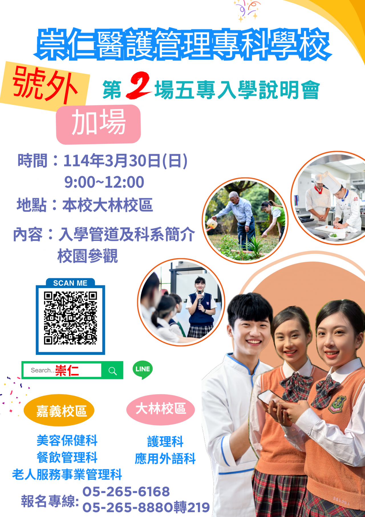 | 四、 | 聯繫方式:(05)2656168 / (05)2658880 分機 219 招生中心。 |