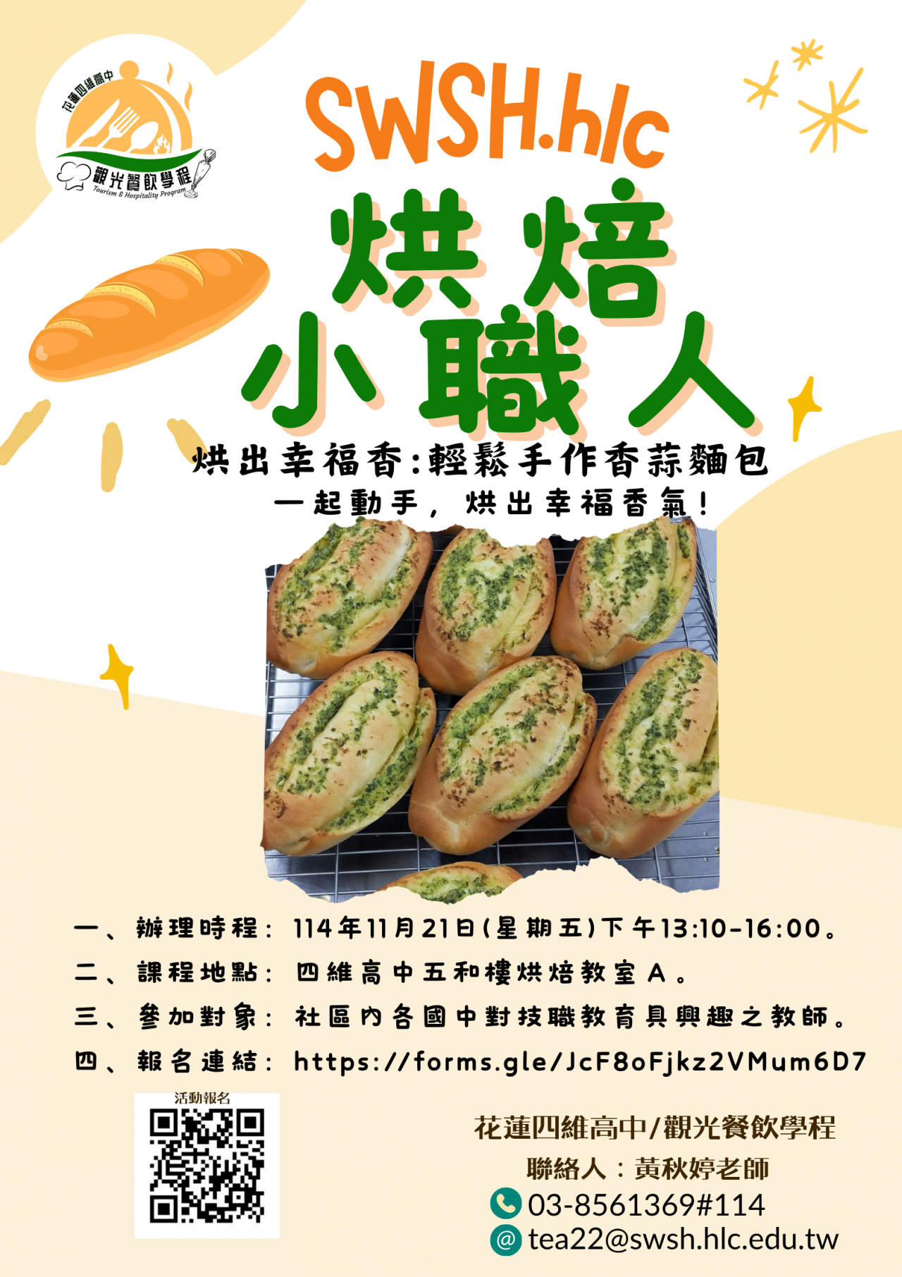 | (二) | 研習地點:花蓮縣四維高級中學五和樓烘焙教室 A 。(花蓮市中山路一段 200 號) |
