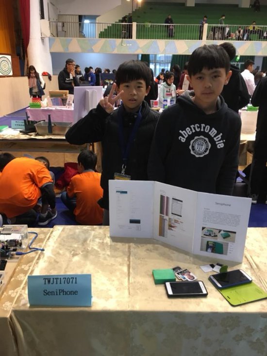 花崗國中榮獲金牌的作品為「Seniphone」,其創意特色為可不必記得電話號碼就可以打電話,讓記憶力不好的年長者或認知能力受限制的身心障礙者,可以使用圖像或照片式的卡片,插入設計好的裝置,透過藍芽連線手機撥打要連絡的人,即使剛認識的人也可輸入一個空白卡片來使用,非常方便。辨識連絡人的原理是在卡片上打洞,利用不同的打洞方式讓手機知道要連絡的是哪一位連絡人,並撥打該聯絡人的電話,非常簡單方便,製作成本低,是個可以立即商品化的發明。本作品是由花崗國中 7年級王家偉和中正國小 6年級陳學瑋共同完成,兩人時常參加花崗國中李恩銘校長的科學營,又一起在校外參加王虎老師的小工程師教室,有次一起討論如何讓記憶力不好的老人也能正確的撥打電話,而有了「Seniphone」的雛形,透過王虎老師的指導,兩位學生甚至半夜還會用通訊軟體詢問該如何修改作品,最後完成一個容易操作又實用的作品,能獲得主辦單位的肯定,是親師生共同努力合作的結果。